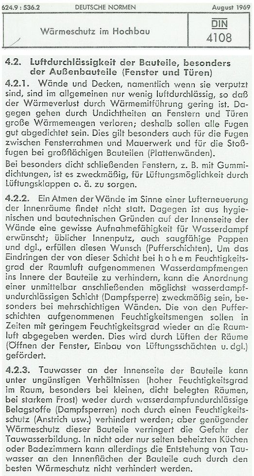 bei den meisten Baubiologen. Ein 25 Jahre alter Artikel eines bekannten Bauphysikers (Künzel-H: »Die "atmend" Außenwand« Gesundheits-Ingenieur 99,1/2 (1978) 20+29-32. ISSN 0720-9312) beschäftigt sich eingehend mit den "Tricks" des Max von Pettenkofer und klärt über die Herkunft des Begriffs "atmende Wand" auf. Schließlich möchte ich noch auf die DIN 4108 von 1969 hinweisen, die sich wie ein Lehrbuch liest: "Ein Atmen der Wände im Sinne einer Lufterneuerung der Innenräume findet nicht statt. Dagegen ist aus hygienischen und bautechnischen Gründen auf der Innenseite der Wände eine gewisse Aufnahmefähigkeit für Wasserdampf erwünscht; üblicher Innenputz, auch saugfähige Pappen und dgl. erfüllen diesen Wunsch (Pufferschichten). Um das Eindringen der von dieser Schicht bei hohem Feuchtigkeitsgrad der Raumluft aufgenommenen Wasserdampfmenge ins Innere der Bauteile zu verhindern, kann die Anordnung einer unmittelbar anschließenden möglichst wasserdampf-undurchlässigen Schicht (Dampfsperre) zweckmäßig sein, besonders bei mehrschichtigen Wänden. Die von den Pufferschichten aufgenommenen Feuchtigkeitsmengen sollen in Zeiten mit geringem Feuchtigkeitsgrad wieder an die Raumluft abgegeben werden. Dies wird durch Lüften der Räume (öffnen der Fenster, Einbau von Lüftungsschächten u.dgl.) gefördert." DIN4108-1969 Zu dem Thema erreichte mich von Herrn Eicke-Hennig folgender Hinweis: |