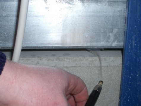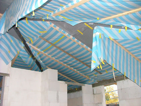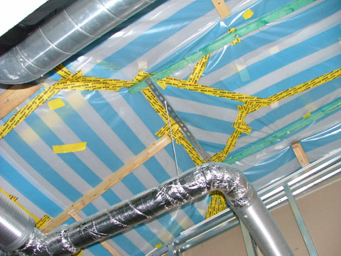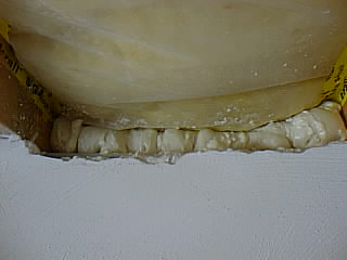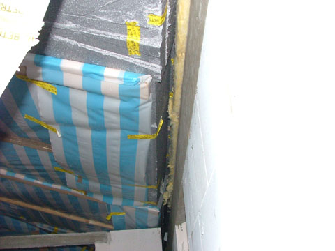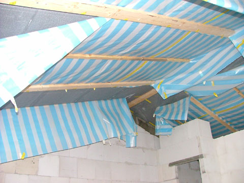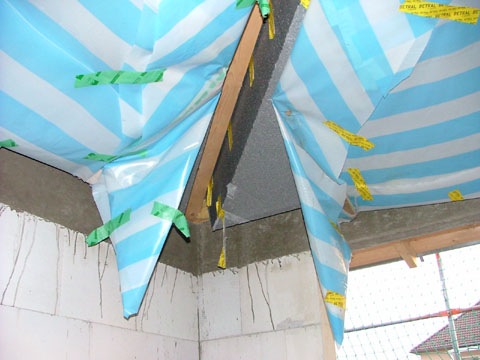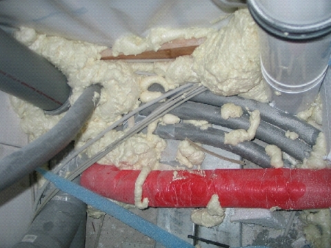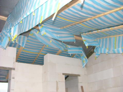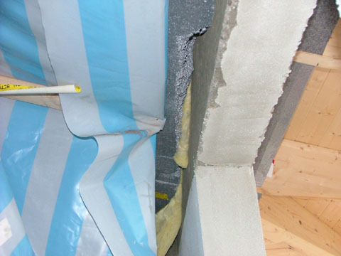 "Bauschaum – die unendliche Geschichte!" Versuch der Herstellung eines Wandanschlusses der, zwischen den Sparren eingebauten, luftdichten Folie. |