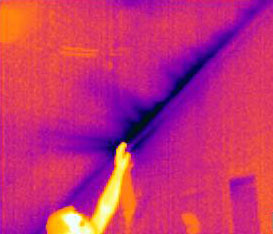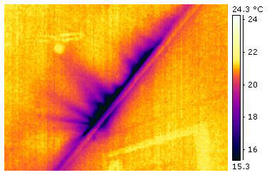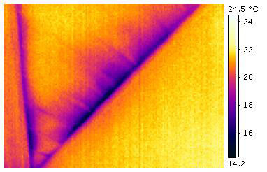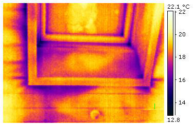 Die Einsatz der Thermografie setzt eine Temperaturdifferenz zwischen der Luft im Gebäude und außerhalb des Gebäudes voraus. Ideal ist eine Temperaturdifferenz von mindestens 8 bis 10 °C. Die Thermografie setzt man am besten von innen im Haus ein. Man geht folgendermaßen vor: Wenn die Temperatur außen höher als innen ist, was im Hochsommer der Fall ist, erwärmen sich die Strömungswege entsprechend. Sie sind dann ebenfalls sichtbar. Im Folgenden sind einige typische Beispiele zu sehen. Bis auf das erste Bild sind die Aufnahmen mit der Kamera ThermaCAMTM B2 von FLIR gemacht. |