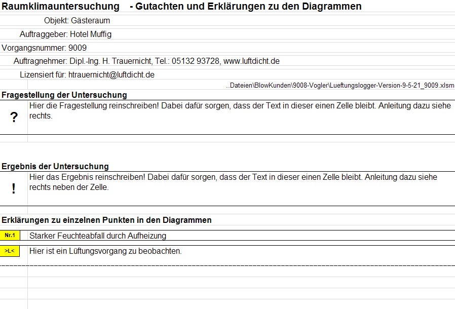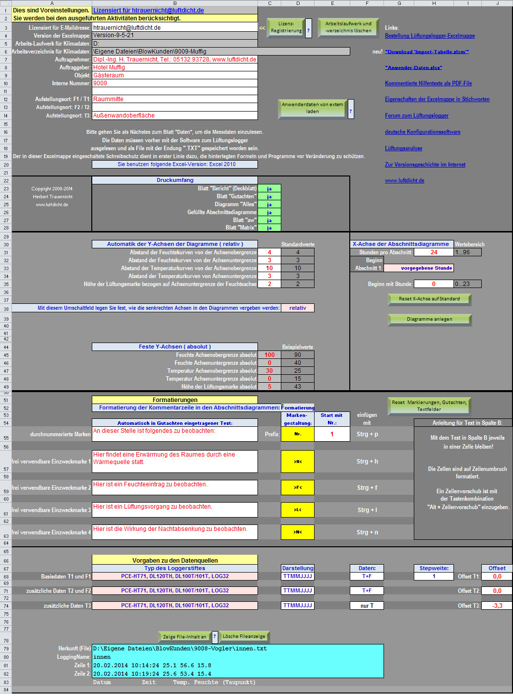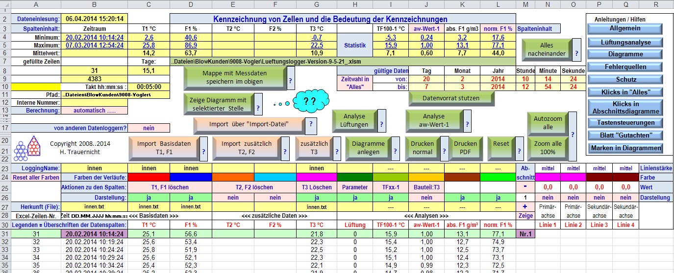 Sie können hier einige wesentliche Blätter der Lüftungslogger-Excelmappe erkunden, indem Sie jeweils mit der Maus über das Bild fahren. Es erscheinen dann Informationen zu den einzelnen Möglichkeiten. Mit einem Mausklick verschwindet die Information wieder. Über die Blattreiter können Sie weitere Blätter aufrufen. Die grau hinterlegten Infos entprechen den Hilfen, die auch in der Excelmappe selbst aufgerufen werden können. Es ist der Stand von Ende 2014. Viel Spaß!