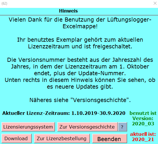Das aktuelle Exemplar der Lüftungslogger-Excelmappe hat die Versionsnummer 2020-21 |