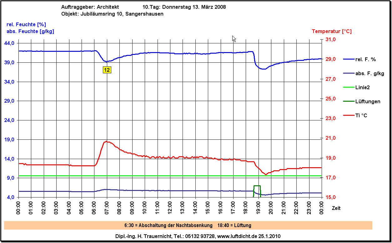 Richtig erschrecken tut sich der Mensch, wenn sich an Außenwänden Schimmel bildet. Dass der gesundheitsschädlich sein kann, hat sich herumgesprochen. Oft gibt es Streit zu der Frage, ob der Nutzer ausreichend lüftet. Da kann es sinnvoll sein, mit einem Lüftungslogger über einen längeren Zeitraum die Klimadaten aufzuzeichnen und anschließend auf Lüftungsereignisse zu analysieren. Ich benutze dafür die von mir entwickelte Software des Lüftungsloggersystems auf Excelbasis. Es ist sicher sinnvoll, eine neutrale Instanz mit einer solchen Analyse zu beauftragen. Das System kann bei mir bezogen werden. Für die Auffindung eines Gutachters, der das Lüftungsloggersystem benutzt, können Sie sich der Raumluftkarte bedienen. Im folgenden Diagramm ist ein Lüftungsvorgang um etwa 19:00h zu sehen.