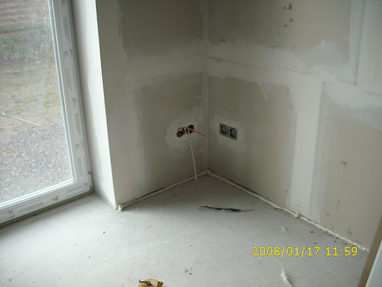 Zugluft aus einer Steckdose kann verschiedene Ursachen haben. Im dargestellten Beispiel konnte nachgewiesen werden, dass die Luft vom Fußboden her über Kabelschlitze im Mauerwerk zu den Steckdosen geleitet wird. Die Kabelschlitze sind zum Raum hin mit "Trockenputz" verdeckt worden |