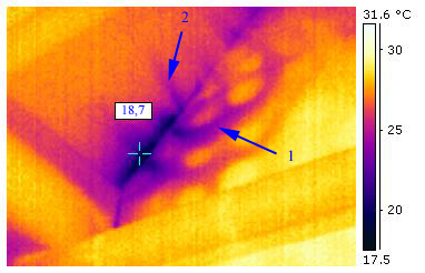 Die dargestellte Thermografie wurde aufgenommen, nachdem über längere Zeit ein Unterdruck von 50 Pa im Gebäude gehalten wurde. In dieser Deckenecke befindet sich offensichtlich eine Leckage in der Luftdichtigkeitsebene. Im Einzelnen ist zu sehen: Während im Raum eine Temperatur von 28 °C herrscht, kühlt sich die Ecke auf 18 °C ab. Außen haben wir eine Temperatur von etwa 16 °C. Die prilartigen Kanäle (z.B. Pfeil 1) zeigen an, dass Luft hinter den Gipskartonplatten strömt (hier von links nach rechts). Die noch nicht verspachtelte Fuge lässt die kalte Luft in den Innenraum austreten. Dies ist an geradstrahligen (z.B. Pfeil 2) Auskühlungen erkennbar, die nicht von der Hinterseite, sondern an der Oberfläche durch die vorbeistreichende Luft geschieht. Diese Austrittstellen stellen sich in der Thermografie meist als typische Fahnen dar. |
