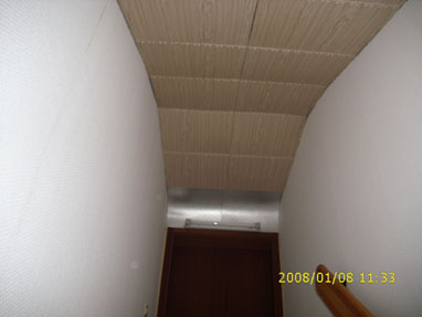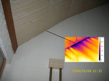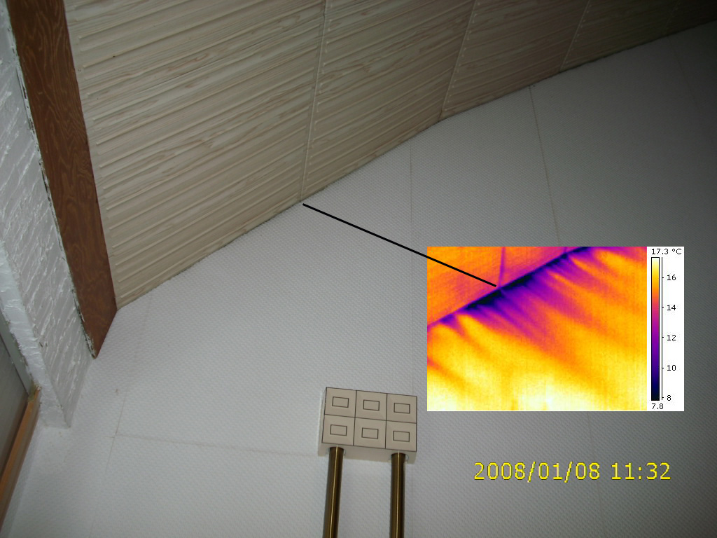 In diesem Haus mit einem Treppenaufgang zu einem unbeheizten Boden klagte man über "Fußkälte". Mit Unterdruck im Haus wurde mit Hilfe der Thermografie herausgefunden, dass es im Bereich der Decke des Treppenaufgangs erhebliche Luftundichtigkeiten gibt. Die Verbesserung ist recht einfach möglich: Es kann unterhalb der bestehenden Decke ein neue luftdichte Decke eingezogen werden, die allseitig luftdicht angeschlossen wird. Das ist leicht zu realisieren, weil beidseitig der Decke massive Wände vorhanden sind. Bei der Gelegenheit kann auch gleich dämmungsmäßig nachgebessert werden. |