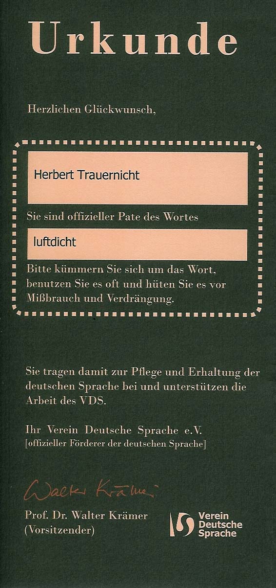 Darin steht: Bitte kümmern Sie sich um das Wort, benutzen Sie es oft und hüten Sie es vor Mißbrauch und Verdrängung. Könnte ein anderes Wort besser passen? Ich kümmere mich als Prüfer der Luftdichtheit täglich nicht nur um das Wort. Ich benutze es ständig. Ich hüte es vor Mißbrauch, indem ich dafür sorge, dass nicht etwas luftdicht genannt wird, was nicht luftdicht ist, und Verdrängung vermeide ich auch gerne. Bei dem Thema "luftdicht" gibt es noch viel zu lernen und zu entwickeln. Fangen wir mal mit der Aussprache an: Aussprache "luftdicht" (Quelle: http://dict.leo.org/). Bei Benutzung der dort vorhandenen Links den PC-Lautsprecher einschalten! Hier finden Sie weiterführende Informationen zu dem Wort luftdicht: canoo.net Der Verein Deutsche Sprache e.V. schreibt: |